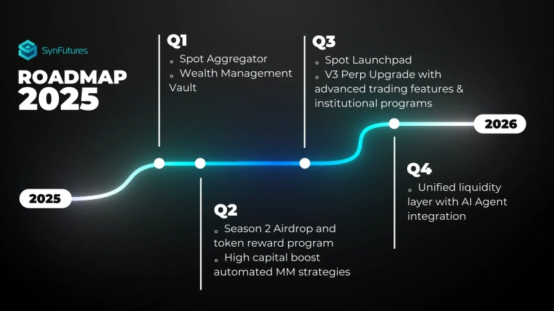 According to the roadmap, in the first quarter of 2025, SynFutures plans to offer services that allow users to provide asset exchange liquidity and earn profits through a spot aggregator and wealth management vaults.