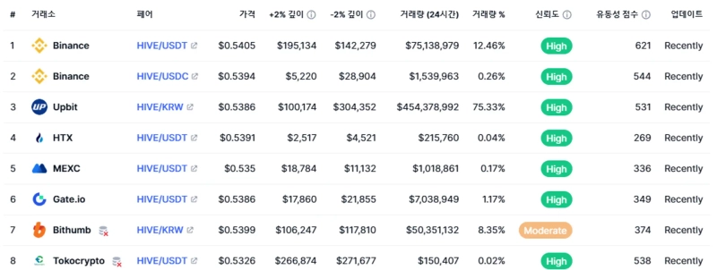 - 75% of Hive's trading volume occurred on Upbit, while 12% occurred on Binance.