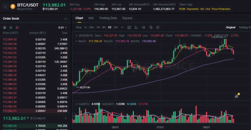 As of 11:43 PM, Bitcoin is trading at $113,982, down 1.07% compared to 24 hours ago.