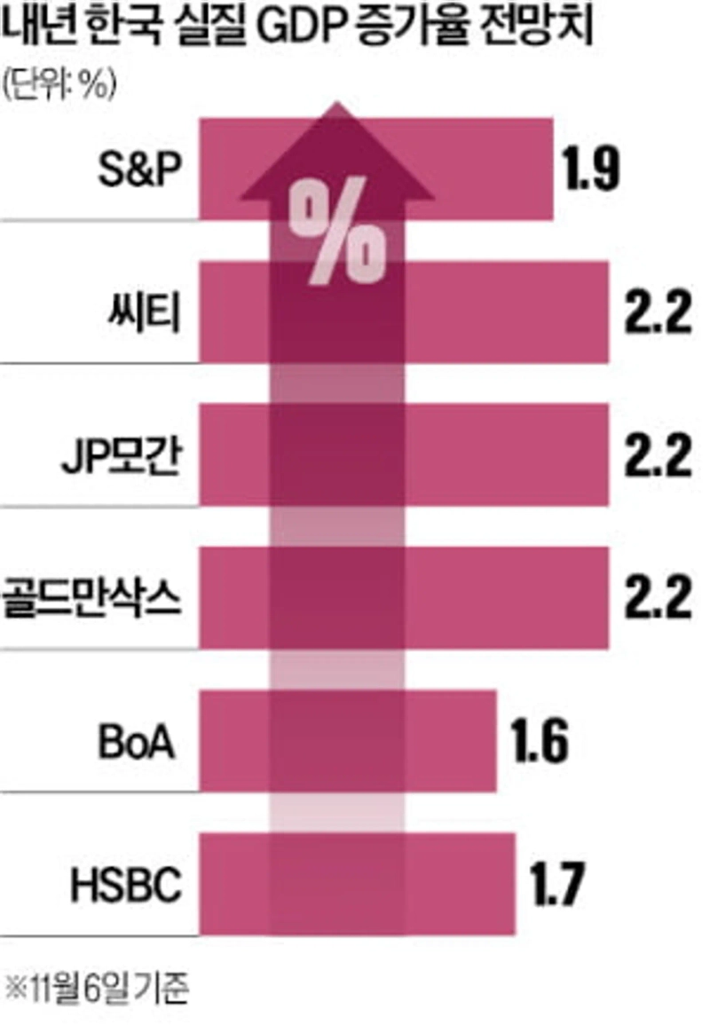 S&P는 한국의 내년 실질 국내총생산(GDP) 증가율을 1.9%로, 지난 4월에 비해 0.1%포인트 하향했다. 기획재정부(1.8%)와 한국은행(1.6%)의 전망치에 비해 0.1%포인트에서 0.3%포인트 높은 수준으로, 최근 글로벌 투자은행(IB)들의 전망치에 부합한다. 국제금융센터에 따르면 지난달 기준 주요 IB 8곳이 제시한 한국의 실질 GDP 증가율은 평균 1.9%로 집계됐다. 이는 한 달 전인 9월 말(1.8%)보다 0.1%포인트 높아진 수준이다. JP모간과 골드만삭스, 씨티 등 세 곳은 2.2% 성장을 예상했다.