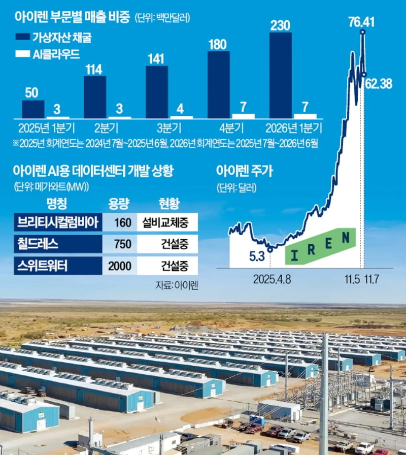 아이렌은 2018년 미국과 캐나다의 신재생에너지 생산지에서 저렴한 전기료로 비트코인을 채굴한 뒤 매도하는 가상자산 채굴 기업으로 출발했다. 비트코인 채굴은 여전히 아이렌의 주력 부문이다. 2025회계연도 기준 매출 5억100만달러 중 96.8%에 해당하는 4억8500만달러가 여기서 발생한다. 아이렌은 5월 비트코인 채굴 장비 투자를 마무리하고 수랭식 AI 데이터센터 사업에 투자하겠다고 발표했다. 아이렌 데이터센터의 그래픽처리장치(GPU)를 고객사와 클라우드로 연결해 연산을 위탁 처리하겠다는 구상이다. 이를 위해 3개의 데이터센터를 건설 및 확장한다는 계획도 밝혔다.