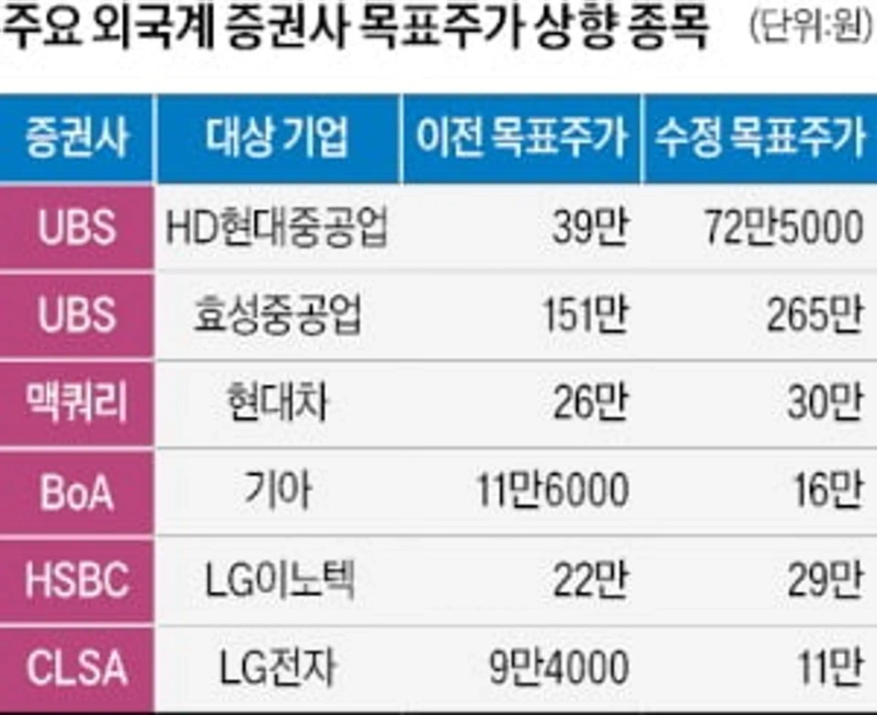 다른 외국계 증권사도 속속 국내 대형주 목표주가를 상향하고 있다. 스위스 UBS는 최근 HD현대그룹 관련 보고서를 통해 주요 계열사 목표주가를 대폭 상향했다. HD현대중공업 투자의견을 기존 '중립'에서 '매수'로 올리며 목표주가를 39만원에서 72만5000원으로 86% 높였다. HD한국조선해양 목표주가는 34만원에서 64만원으로 88% 상향 조정했다.