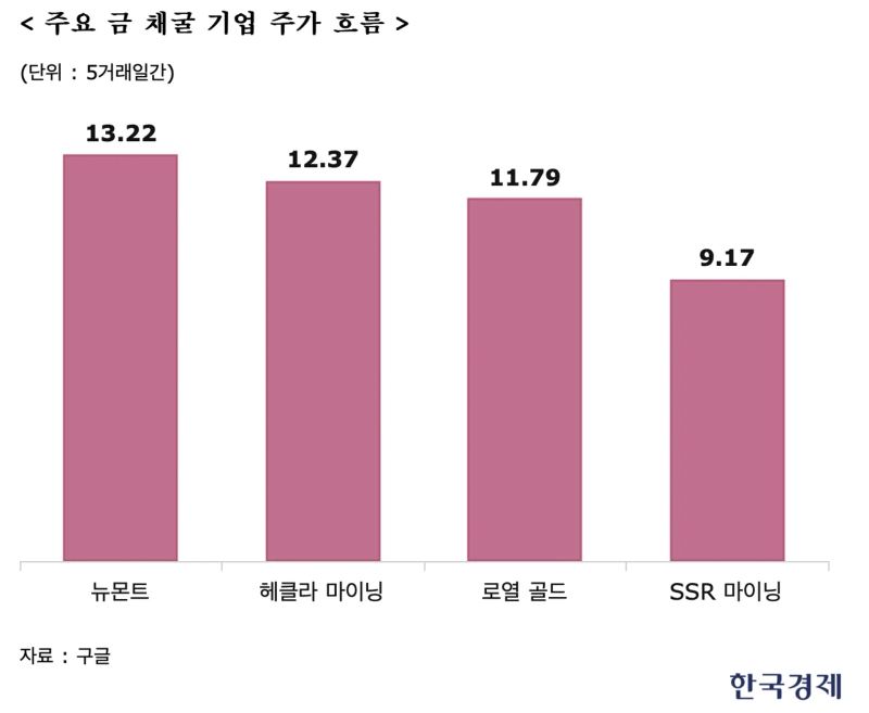 세계 1위 금광 기업인 뉴몬트는 12일(현지시간) 미국 뉴욕증시에서 3.53% 오른 93.07달러에 거래를 마쳤다. 올 들어 지난달 20일까지 155% 급등하던 주가는 금리인하 기대가 후퇴하면서 2주간(10월20일~11월4일)까지 약 17% 하락했다. 하지만 최근 금리인하 가능성이 부각되자 최근 5거래일간 13%가까이 상승했다. 귀금속 채굴기업 헤클라 마이닝도 같은 기간 12.37% 올랐고 로열 골드(11.79%), SSR 마이닝(9.17%), 노바골드 리소시스(8.58%) 등도 오름폭을 확대했다