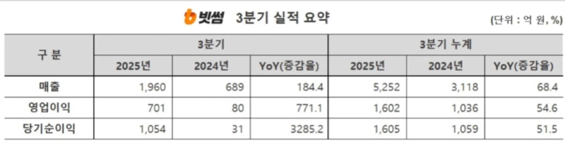3분기 누적 매출 5,252억 원, 영업이익 1,602억 원, 당기순이익 1,605억 원으로 집계돼 작년 같은 기간보다 각각 68%, 54%, 51% 증가했다.