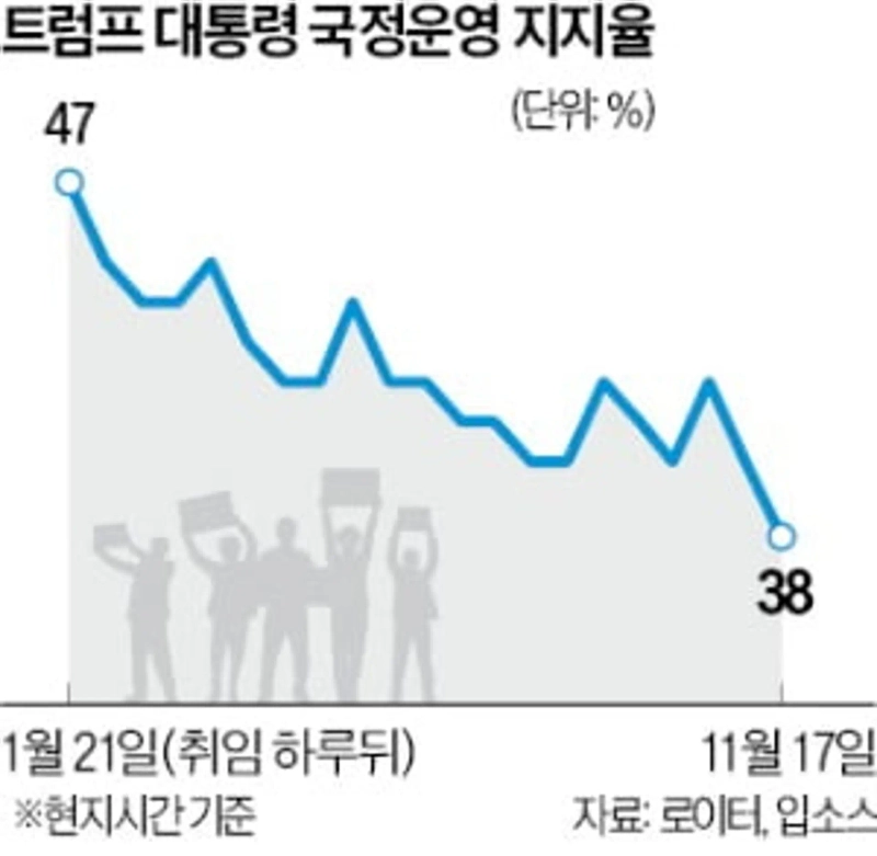 트럼프 대통령 지지율도 곤두박질치고 있다. 로이터통신이 여론조사기관 입소스에 의뢰해 이날 공개한 여론조사 결과(표본오차 ±3%포인트) 트럼프 대통령 지지율은 38%로 나타났다. 트럼프 2기 행정부 출범 하루 뒤인 1월 21일 지지율(47%)보다 9%포인트 하락했다. 집권 2기 들어 최저다. 트럼프 1기 최저 지지율(33%), 조 바이든 전 대통령 최저 지지율(35%)과 비슷한 수준이다. 이번 조사는 지난 14∼17일 미국 성인 1017명을 대상으로 했다.