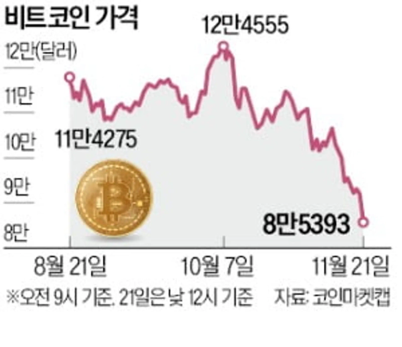 비트코인 가격이 8만5000달러대로 주저앉았다. 국내 시장에서도 1억2000만원대까지 추락했다. 세계 시가총액 1위인 엔비디아의 깜짝 실적 효과로 전날 비트코인 가격이 소폭 반등했지만, 금리 인하 기대감 축소와 인공지능(AI) 거품론 재확산 등의 여파로 하루 만에 다시 하락세로 전환했다.
