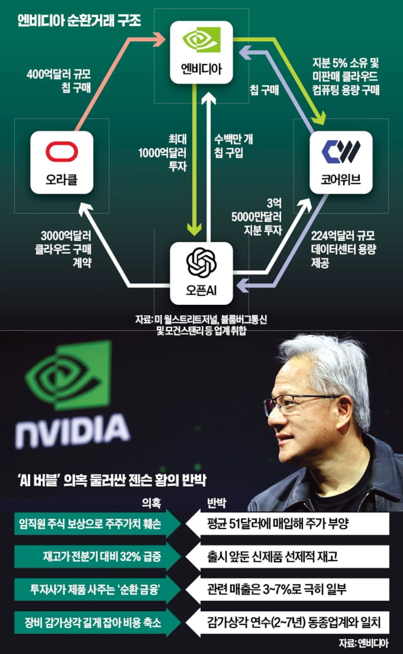 엔비디아의 반박 자료는 영화 '빅쇼트' 주인공으로 알려진 마이클 버리 사이언애셋매니지먼트 창립자 등이 제기한 AI 거품론의 내용을 조목조목 반박하는 내용으로 채워졌다. 매출채권 회전 일수 증가, 재고 자산 증가, 엔비디아가 투자한 기업이 다시 엔비디아 제품을 사들이는 '순환금융' 등 최근 논란이 된 내용에 관한 엔비디아의 공식 입장을 담았다.