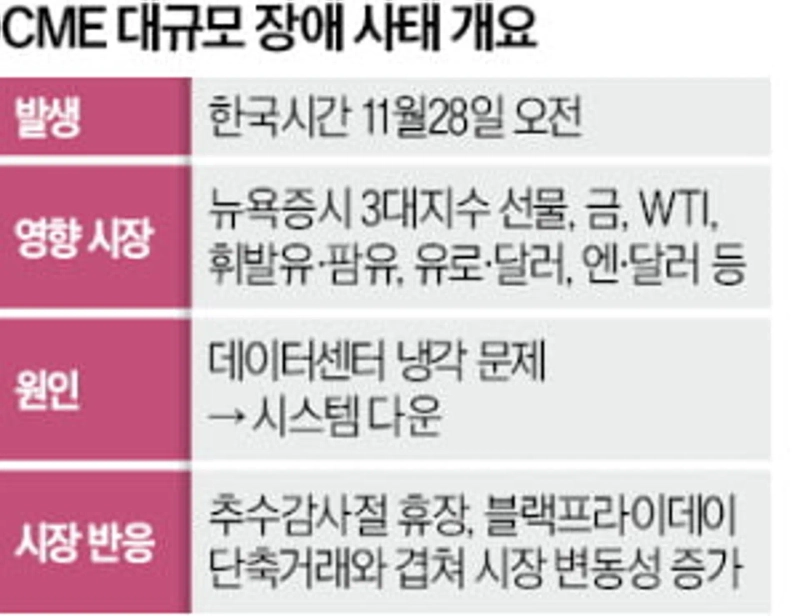 - 세계 최대 파생상품 거래소인 CME그룹의 거래 플랫폼이 마비되며 주가지수, 외환, 원유, 국채 등 핵심 선물·옵션 거래가 전면 중단됐다고 전했다.