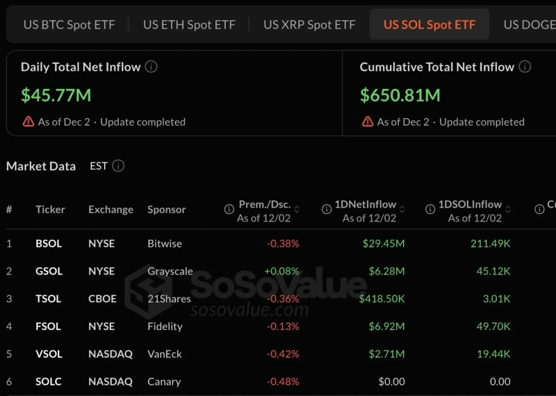 미국 솔라나(SOL) 현물 ETF가 2일(현지시간) 4577만달러의 순유입을 기록했다.