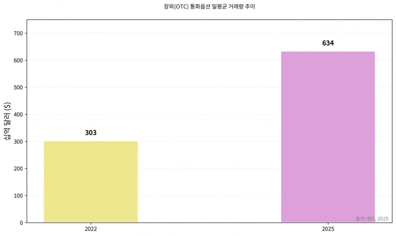 주목할 점은 FX 옵션거래의 급증이다. BIS에 따르면 장외(OTC) 통화옵션 일평균 거래는 2022년 3030억 달러 수준에서 2025년 6340억 달러로 두 배 이상 늘어났다. 기업들이 단순한 선물환 거래로는 감당할 수 없는 리스크를 방어하기 위해 더 비싼 보험료를 내고 옵션 시장을 찾고 있다는 뜻이다.