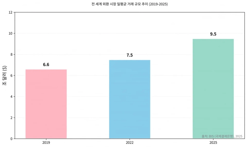12일 국제결제은행(BIS)과 금융투자업계에 따르면 지난 4월 기준 전 세계 외환 시장의 일평균 거래 규모는 9조 5,000억 달러로 2022년보다 27% 증가했다. 실물 교역이 늘어서가 아니다. 불안해진 시장 참여자들이 앞다퉈 헤지(보험) 상품을 사들였기 때문이라는 분석이다.