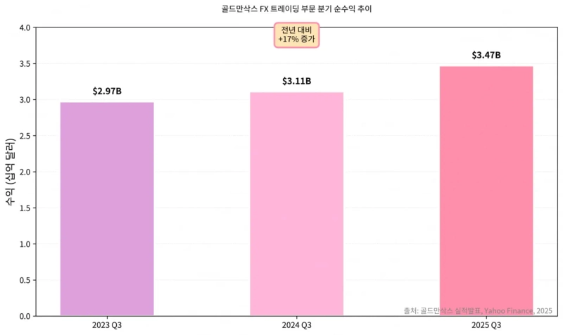 야후 파이낸스와 업계 분석을 종합하면 골드만삭스의 올 3분기 채권·외환·원자재 부문 순수익은 34억 7,000만 달러를 기록했다. 전년 동기 대비 17% 증가했다. 금융 전문 매체 '리스크 넷'과 'FX Markets'의 분석에 따르면, 골드만삭스의 지난해 연간 FX 트레이딩 수익은 전년 대비 125% 증가한 63억 달러로 미국 은행 중 1위를 차지했다.