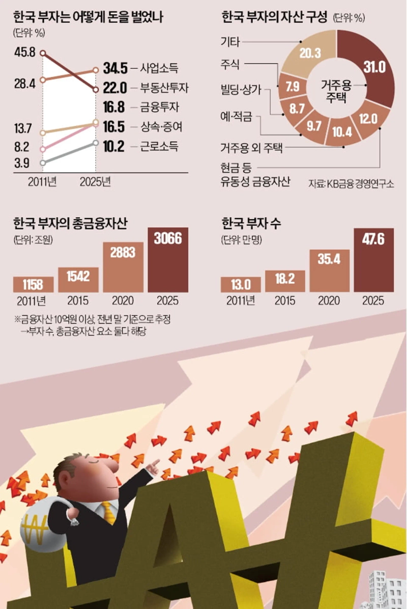 KB금융그룹 경영연구소가 14일 발간한 '2025 한국 부자 보고서'에 따르면 지난해 말 기준 금융자산을 10억원 넘게 보유한 한국 부자는 47만6000명이었다. 이는 전체 인구의 0.92%에 해당한다. 전년 대비 3.2% 증가한 수치다. 이 조사가 시작된 2011년(13만 명)과 비교하면 네 배 가까이 늘어났다. 연평균 증가율은 9.7%였다.