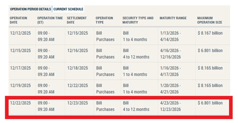 22일(현지시간) 코인텔레그래프는 "연준이 이번 주에만 68억달러 규모의 유동성을 추가로 공급할 예정이며, 최근 10일간 누적 유동성 투입 규모는 380억달러에 달한다"고 전했다. 이는 주로 환매조건부채권(레포·Repo) 운영을 통해 은행 시스템에 단기 자금을 공급하는 방식이다.