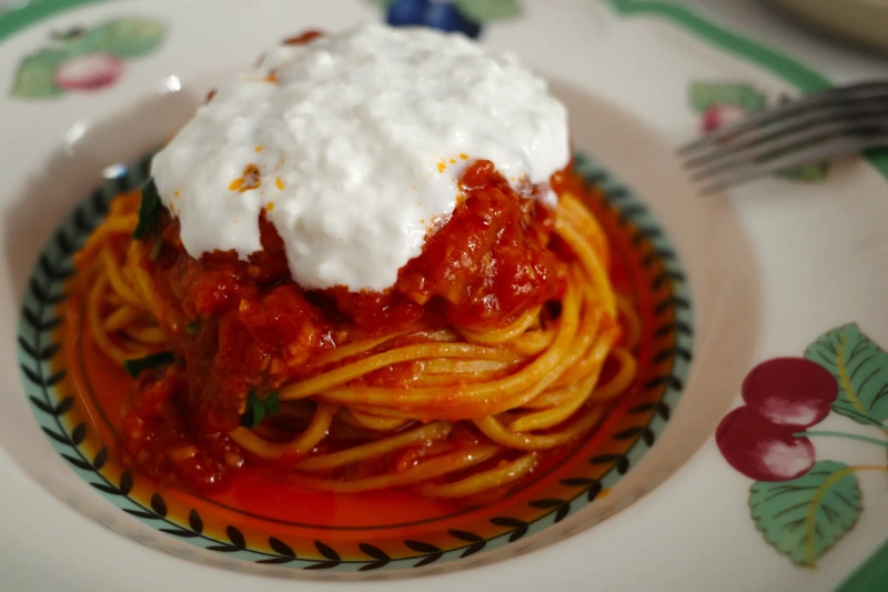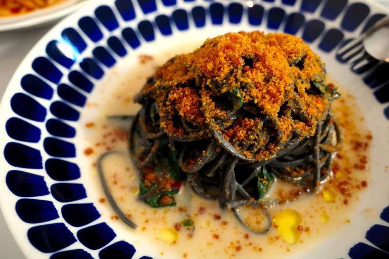 이야기를 나누던 중 주문한 토마토 파스타와 보따르가 파스타가 나왔다. 토마토 파스타 위에 듬뿍 올려진 치즈의 풍미가 토마토 소스의 감칠맛을 더했다. 보따르가 파스타는 구운 마늘을 갈아 넣은 버터 소스에 어란을 곁들인 먹물 파스타다. 어란과 버터 소스의 조합이 인상적이었다. 보따르가 파스타는 김 그로스가 레스토랑 우오보를 찾을 때 광어 까르파치오와 함께 늘 주문하는 메뉴다.
