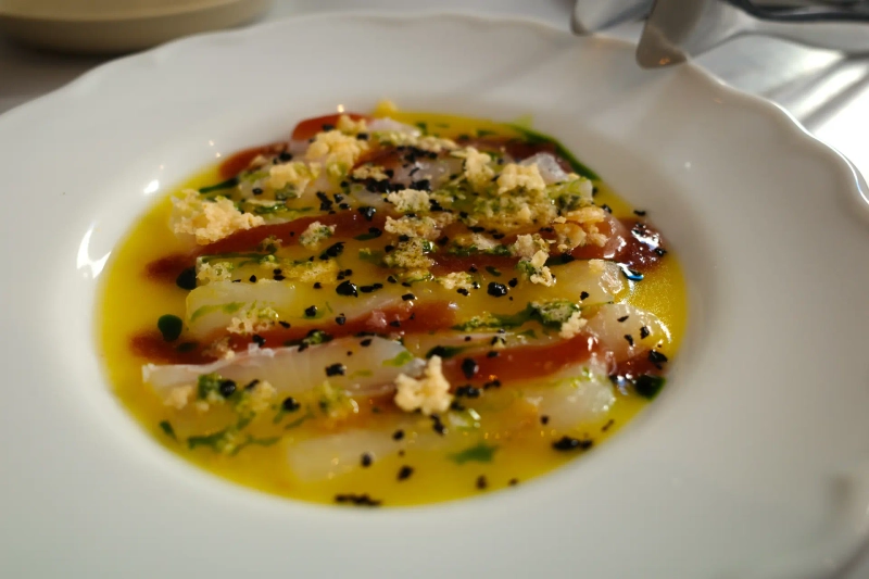 우선 애피타이저로 광어 까르파치오를 주문했다. 숙성한 광어회에 레몬, 석류, 블랙 올리브 등을 곁들인 요리다. 식전빵으로 나온 포카치아를 먹은 후 까르파치오를 맛봤다. 과일의 산뜻함과 숙성회의 쫄깃함이 어우러져 감칠맛을 냈다. 김 그로스는 "(까르파치오는) 이 식당에 오면 항상 주문하는 메뉴"라며 "상큼함이 있어 입맛을 돋궈주는 것 같다"고 말했다.