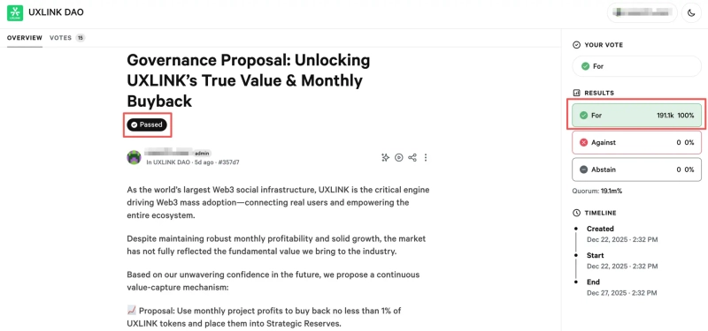 웹3 소셜네트워크(SNS) 프로젝트 유엑스링크(UXLINK)는 27일(한국시간) 엑스(구 트위터)를 통해 "'바이백 및 전략적 준비금' 거버넌스 제안이 100%의 지지로 통과됐다"고 전했다.