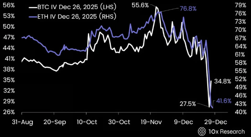 29일(현지시간) 10x리서치는 주간 보고서를 통해 "비트코인과 이더리움 파생상품 포지션, 변동성, 자금조달 금리, 상장지수펀드(ETF) 및 스테이블코인 흐름, 옵션 시장 동향 등을 종합적으로 점검한 결과, 시장이 안정된 것처럼 보이지만 작은 충격에도 크게 흔들릴 수 있는 상태"라고 평가했다.