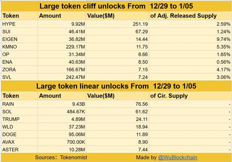 같은 기간 하루 기준 100만달러 이상이 순차적으로 풀리는 '리니어 언락' 대상에는 레인(RAIN), 솔라나(SOL), 오피셜트럼프(TRUMP), 월드코인(WLD), 도지코인(DOGE), 아발란체(AVAX), 아스터(ASTER) 등이 포함됐다. 리니어 언락은 즉각적인 충격은 제한적일 수 있으나, 누적될 경우 지속적인 매도 압력으로 작용할 가능성이 있다.