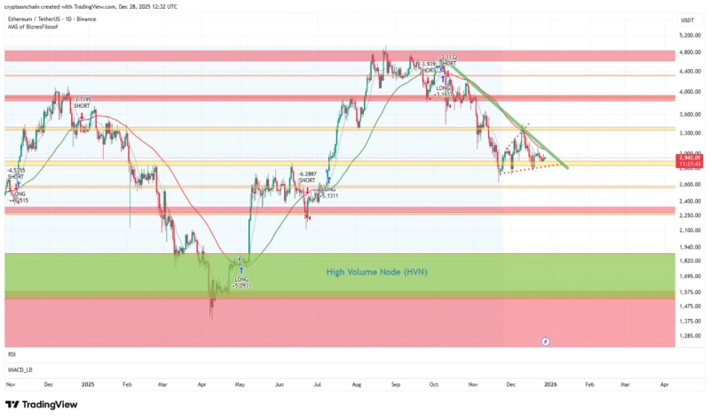 가격 구조 역시 기술적으로 중요한 위치에 놓여 있다. 현재 이더리움은 하락 추세선 저항 아래에서 거래되고 있지만, 2800달러 선은 유지하고 있다. 이 가격대는 주요 고거래량 구간(HVN)과 겹치는 영역으로, 최근 수주 동안 여러 차례 하락을 방어해 온 핵심 수요 구간으로 평가된다.