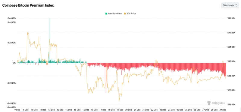 미국 시장의 비트코인(BTC) 수급을 가늠하는 코인베이스 프리미엄 지수가 15일 연속 음수 구간에 머물고 있는 것으로 나타났다.