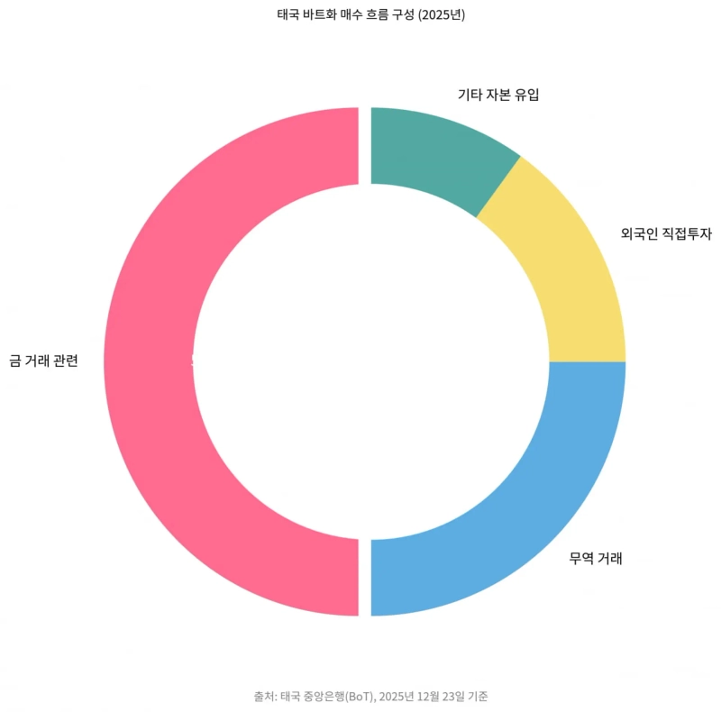 국제 금 거래의 결제 통화는 미 달러화다. 딜러들은 해외에 금을 팔아 받은 막대한 달러를 태국 외환시장에 쏟아내며 바트화를 사들여야 한다. '금 매도 급증 → 대규모 달러 유입 → 바트화 집중 매수 → 환율 급락(바트화 가치 상승)'의 고리가 형성되는 것이다.