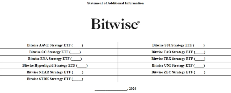 해당 문건에 따르면 비트와이즈가 신규로 신청하고자 하는 ETF는 총 11개로, 에이브(AAVE), 수이(SUI), 칸톤(CC), 비텐서(TAO), 에테나(ENA), 트론(TRX), 하이퍼리퀴드(HYPE), 니어프로토콜(NEAR), 유니스왑(UNI), 지캐시(ZEC), 스타크넷(STRK) 등이다.