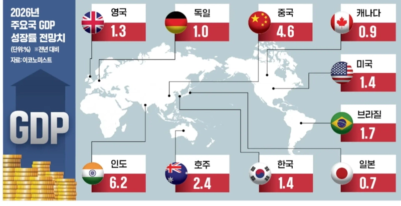 한국의 GDP 성장률은 1.4%, 일본은 0.7%로 예상된다. 다카이치 사나에 일본 총리의 완화적 재정·통화 정책은 국가 부채 증가로 이어질 우려가 있다. 대만 성장률은 2.2%로 예상된다. 미국으로 수출하는 물품들의 프런트로딩(관세 인상 등에 대비해 기업이 물량을 앞당겨 선적하는 것)이 사라지면서 경제 성장이 둔화할 수 있지만 대만이 기술 공급망에서 차지하는 역할을 감안하면 전 세계적인 AI 수요가 대만 경제에 도움이 될 수 있다고 이코노미스트는 평가했다.