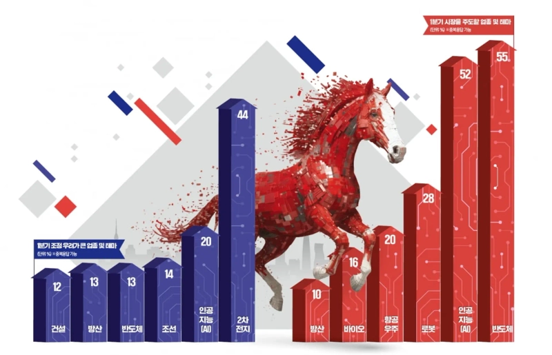 올해 시장을 이끌 업종으로는 반도체를 꼽은 응답자가 많았다. 작년 하반기 주가 상승폭이 컸던 로봇(28%)과 항공·우주(20%) 업종에 관한 긍정적 전망도 눈에 띄었다. 반도체주 상승을 예상한 매니저들은 "데이터센터 등 AI 투자가 이어지면서 반도체 공급 부족이 계속될 것"이라며 "고대역폭메모리(HBM)는 물론 D램과 낸드 등 범용(레거시) 반도체 가격 역시 상승하면서 국내 반도체 기업의 실적이 개선될 수 있다"고 했다.