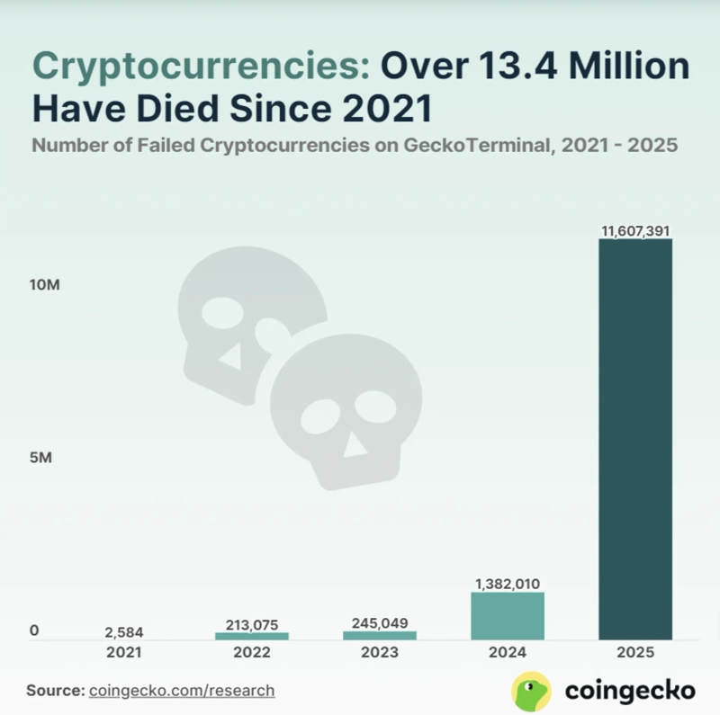 - 2025년 한 해 동안 실패한 가상자산 프로젝트 수가 1160만개를 넘어 역대 최고치를 기록했다고 밝혔다.