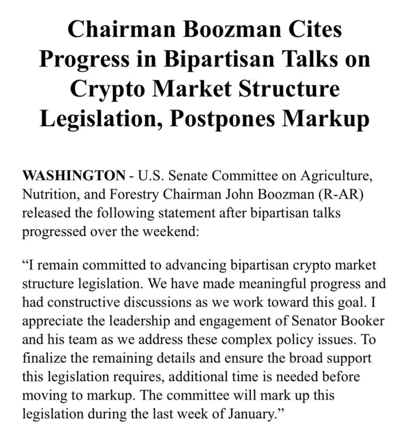 - 미 상원 농업위원회 가상자산 시장 구조 법안 심사가 초당적 합의 필요로 1월 마지막 주로 연기됐다고 밝혔다.