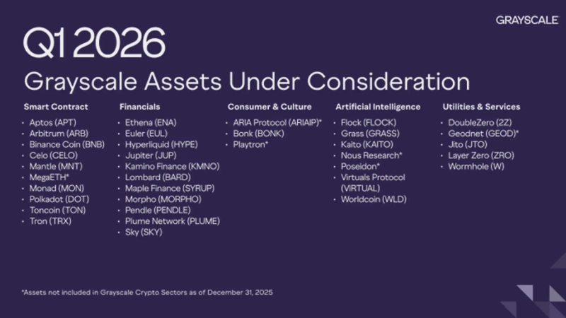 - 그레이스케일은 2026년 1분기 검토 대상 자산 리스트에 총 36개 알트코인을 포함했다고 밝혔다.