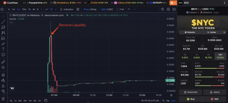 또다른 온체인 분석업체 룩온체인은 해당 토큰과 관련해 "에릭 애덤스 전 뉴욕시장이 출시한 밈코인 NYC에서 가격 고점 부근에 유동성이 제거됐으며, 약 318만달러 규모의 USDC가 유동성 풀에서 빠져나갔다"고 분석했다. 이 과정에서 일부 투자자들이 공포 매도에 나섰고, 특정 트레이더는 20분도 채 되지 않는 시간 동안 약 47만3500달러(손실률 63.5%)의 손실을 본 것으로 전해진다.