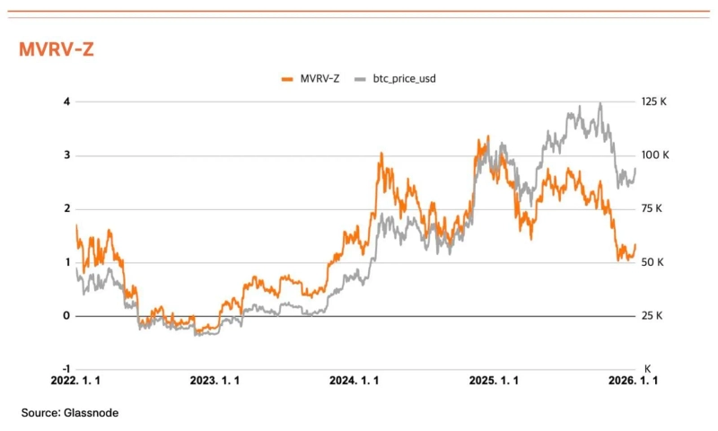온체인은 균형 국면으로 전환: 84K 구간에 '바이 더 딥' 수요가 집중되며 지지선 형성, 98K는 단기 보유자 평균 매수가로 저항선 작용. MVRV-Z 등 주요 지표가 저평가 구간을 벗어나 균형 상태에 도달