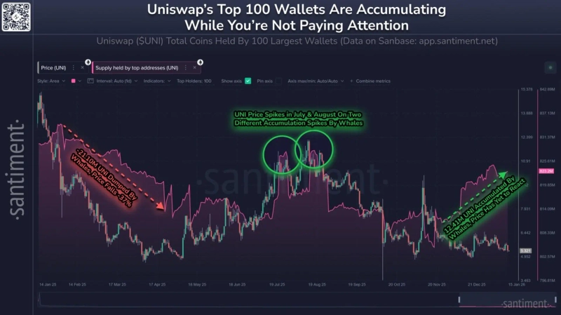 샌티멘트는 "투자자들의 레이더망에서 유니스왑이 잠시 벗어나 있을 수 있지만, 고래들은 바닥권에서 물량을 늘리고 있다"며 "역사적으로 이들 상위 지갑의 움직임은 시가총액 32위 자산인 유니스왑의 가격 향방과 밀접한 상관관계를 보여왔다"고 분석했다.