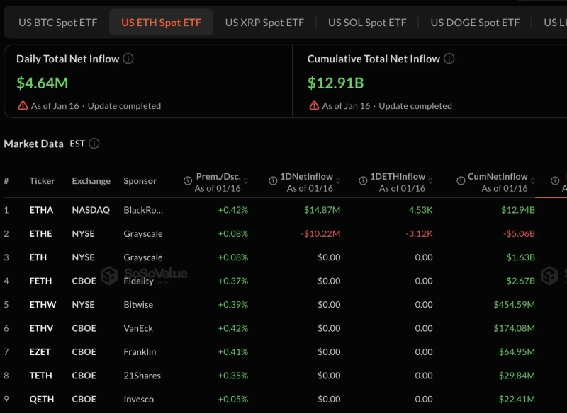 16일 가상자산 데이터 분석 플랫폼 소소밸류에 따르면 이날 미국 이더리움 현물 ETF 9개 종목에서 총 464만달러의 순유입이 발생했다. 다만 유입 강도는 눈에 띄게 약해졌다. 전날(1억6437만달러)보다 약 97%가량 급감했다.