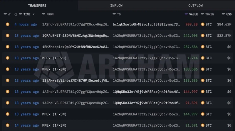 - 13년간 휴면이었던 비트코인 OG 지갑이 깨어나 909.38 BTC 전량을 새로운 지갑으로 이전했다고 전했다.
