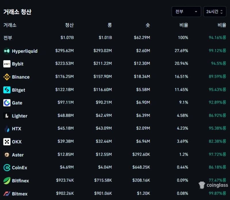 거래소별로는 하이퍼리퀴드(Hyperliquid)가 약 2억9500만달러로 가장 많은 청산을 기록했고, 바이비트(Bybit)가 약 2억2300만달러로 뒤를 이었다. 이어 바이낸스가 약 1억7600만달러, 비트겟이 약 1억2200만달러, 게이트가 약 9700만달러 수준의 청산액을 기록했다. 상위 몇 개 거래소에 청산이 집중되며 변동성이 급격히 확대된 모습이다.