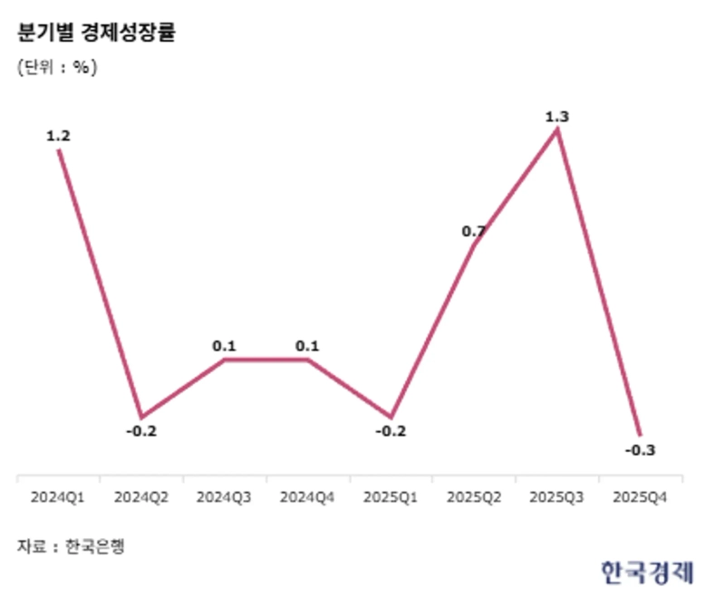 22일 한국은행이 발표한 '2025년 4/4분기 및 연간 실질 국내총생산(속보)'에 따르면 지난해 4분기 우리 경제는 전기 대비 0.3% 역성장했다. 지난해 1분기 -0.2%를 기록한 뒤 3분기 만에 역성장이 다시 나타났다. 이는 지난 2022년 4분기 기록한 -0.4% 이후 가장 낮은 것이다.