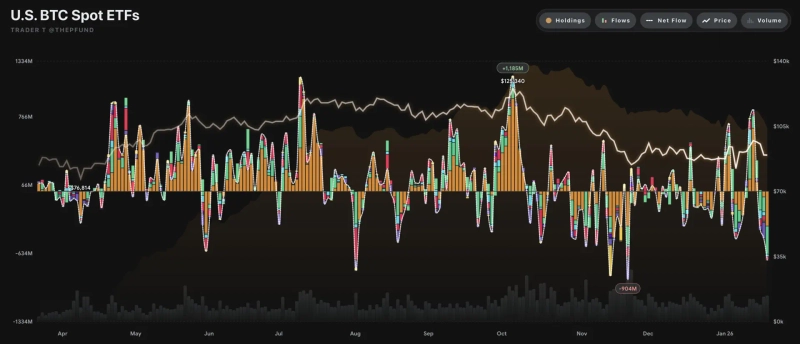 22일 트레이더T 데이터 집계에 따르면 1월 21일(현지시간) 기준 미국 비트코인 현물 ETF 전체 순유출 규모는 7억730만달러로 집계됐다. 이는 최근 두 달 사이 최대 일간 유출 규모로, 대형 ETF를 중심으로 광범위한 자금 이탈이 나타났다는 평가다.