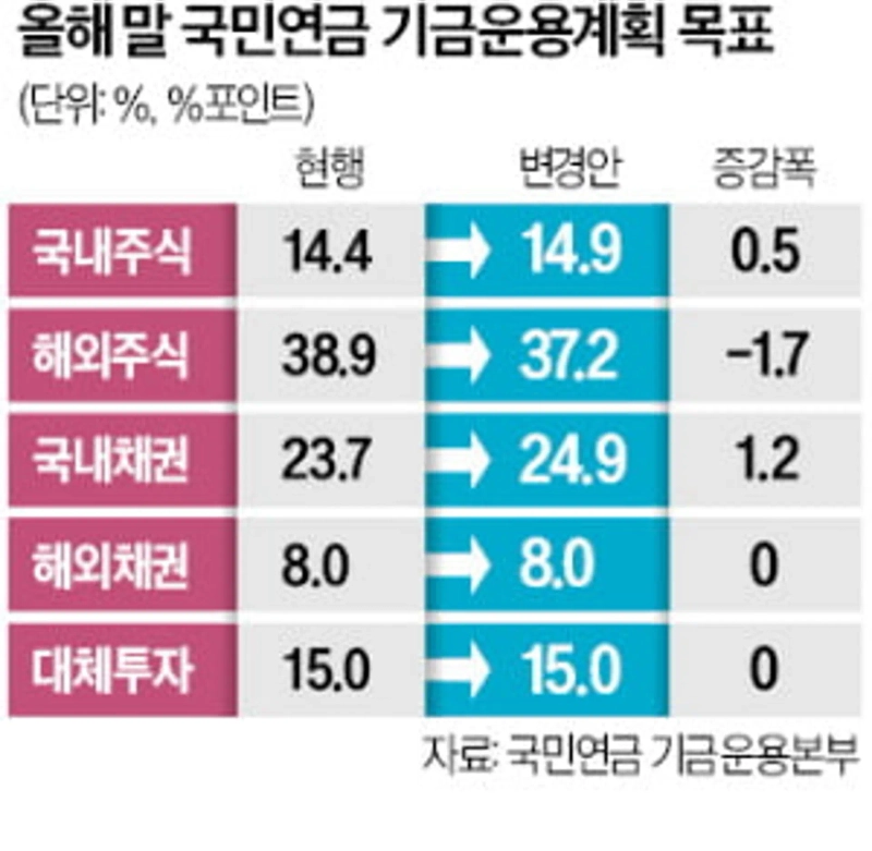 - 국민연금 기금운용위원회가 해외 주식 목표 비중 확대 폭을 줄이고 국내 주식 비중을 늘리는 등 자산배분과 리밸런싱 체계를 재검토하기로 했다고 밝혔다.