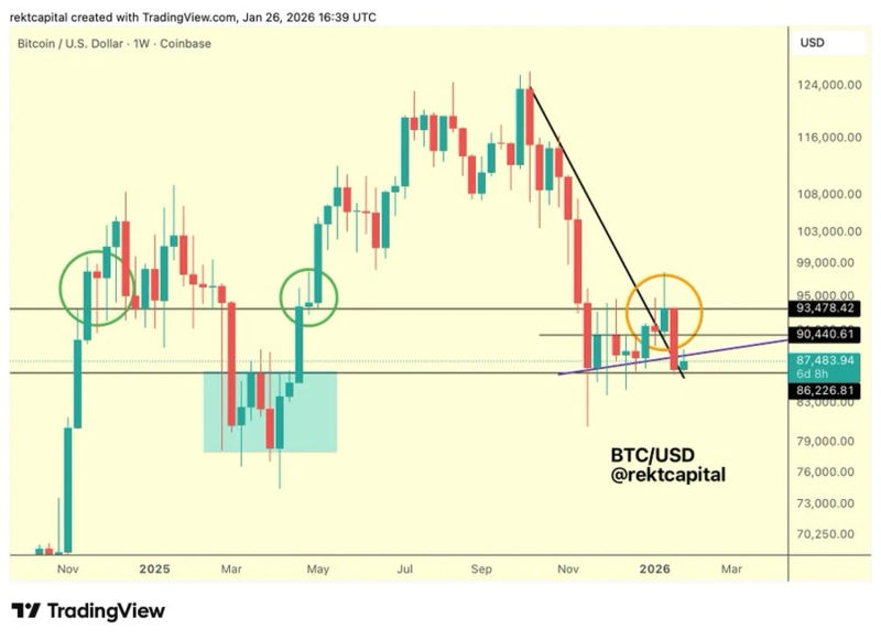 26일(현지시간) 분석가 렉트캐피털(Rekt Capital)에 따르면 비트코인은 이번 주봉에서 중앙 가격대(mid-range)인 9만500달러와 수주간 유지돼 온 고점·저점 상향 추세선를 모두 하회했다. 이는 단기적으로 상승 모멘텀이 약화됐음을 시사하는 신호로 해석된다.