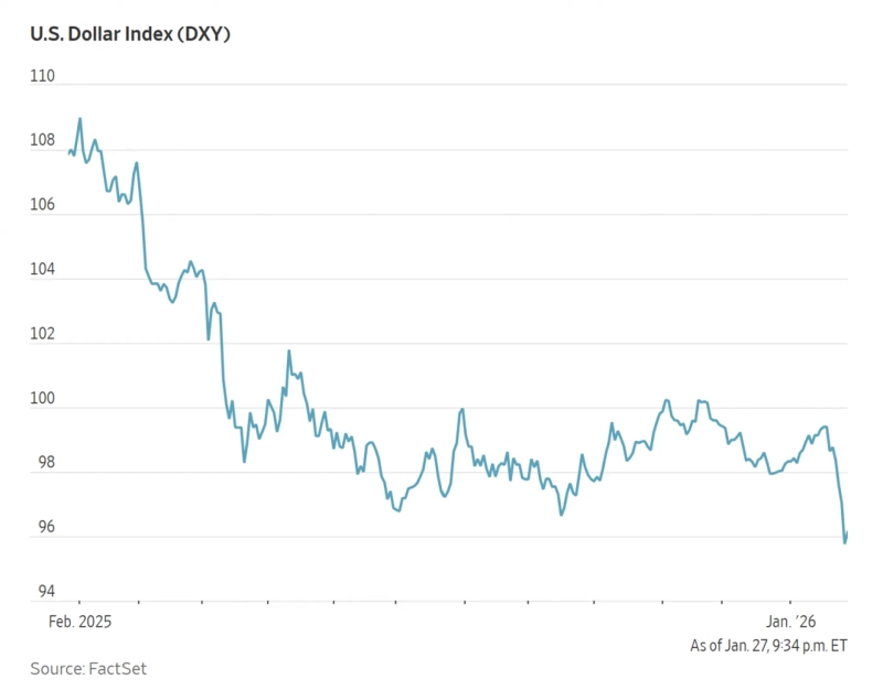 27일(현지시간) 달러인덱스(주요 6개국 통화 대비 달러 가치)는 장중 전장 대비 1.53% 하락한 95.55까지 내려오면서 2022년 2월 이후 최저치를 기록했다. 지난 4거래일 연속 하락 마감해 올해 들어서만 3% 가까이 떨어졌다. 미국과 일본 당국이 엔화 가치 부양을 위해 공동으로 외환시장에 개입할 가능성이 제기됐고 이밖에 Fed에 대한 압박, 트럼프 대통령의 그린란드 합병 야욕, 미국 재정적자 확대 등을 둘러싸고 달러 자산 신뢰도가 약화한 영향이다. 트럼프 대통령 취임 후 유로화는 달러 대비 16% 상승했고 스위스 프랑도 19% 이상 올랐다.