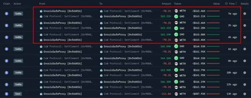 이번 매도는 0xfeb로 시작하는 주소를 통해 이뤄졌다. 해당 주소에서는 일정 수량의 이더리움이 주기적으로 이동한 뒤 스테이블코인 GHO로 전환되는 흐름이 관측됐다.