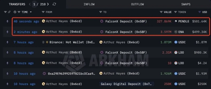 3일 온체인 분석 계정 룩온체인에 따르면 아서 헤이즈는 이날 펜들(PENDLE) 32만7869개와 에테나(ENA) 360만개를 팔콘엑스 거래소로 입금했다. 해당 물량의 규모는 각각 약 50만2000달러, 약 49만9000달러 수준으로 집계됐다.