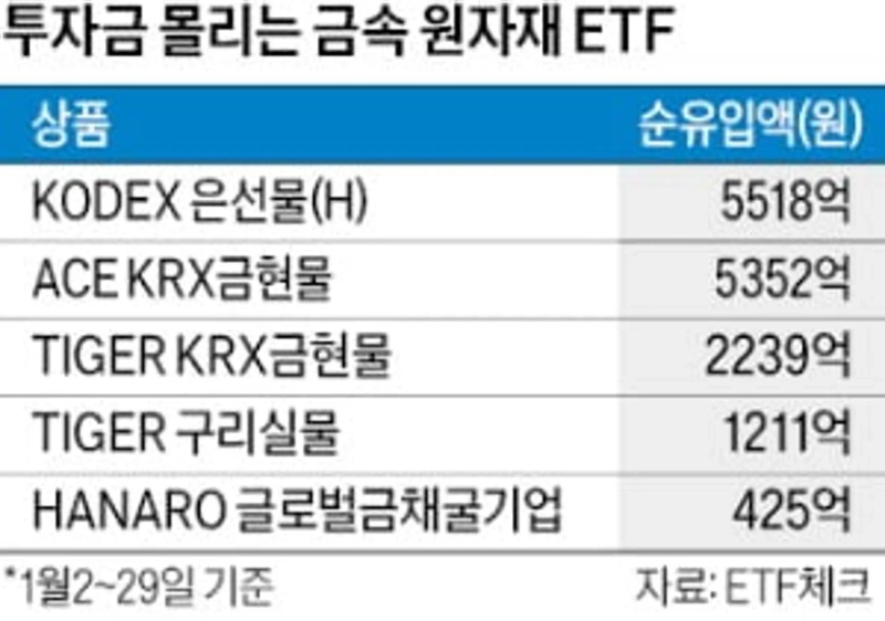 4일 코스콤 ETF체크에 따르면 지난달 금·은·구리에 투자하는 주요 ETF에는 각각 1000억원대 자금이 몰렸다. 'KODEX 은 선물(H)'엔 5518억원, 'ACE KRX 금 현물'엔 5352억원이 순유입됐다. 삼성전자와 SK하이닉스 등 반도체 주요 기업에 투자하는 'TIGER 반도체TOP10'에 같은 기간 순유입된 투자금(1659억원)의 세 배가 넘는 규모다. 구리 투자 ETF 중 가장 순자산 규모가 큰 'TIGER 구리실물'에는 1211억원이 흘러들었다.