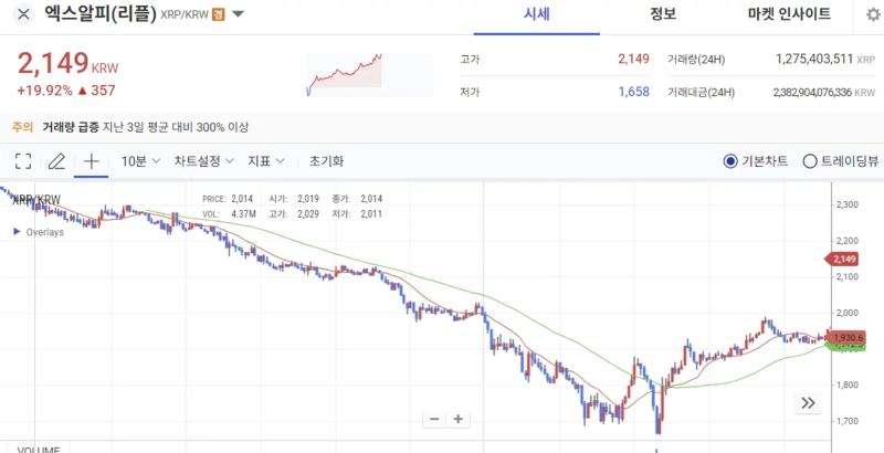 6일(한국시간) 국내 디지털자산 거래소 업비트에서 엑스알피는 전일대비 19.92% 급등한 2149원에 거래되고 있다.