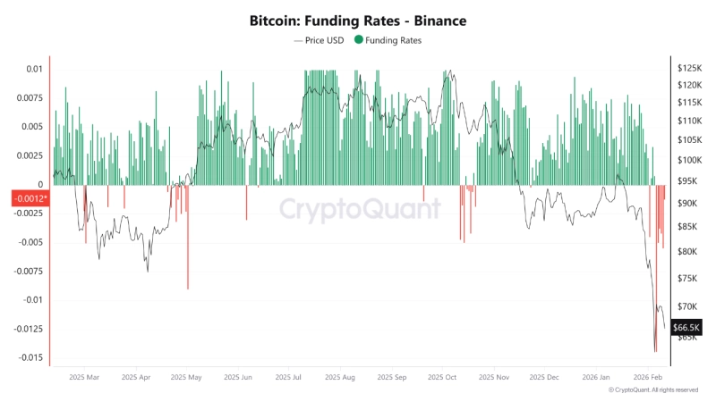 펠리네이PA(PelinayPA) 크립토퀀트 기고자는 12일(현지시간) 크립토퀀트를 통해 "비트코인 가격이 최근 6만 6500달러 부근까지 급락했다"며 "이와 동시에 펀딩비율은 -0.0012 이하로 하락해 간헐적으로 깊은 음수 스파이크를 기록 중"이라고 밝혔다. 펠리네이PA는 "이는 시장이 공격적으로 숏(매도) 포짓녀에 쏠려있다는 의미"라며 "펀딩비율이 음수인 건 숏 포지션이 롱(매수) 포지션에 비용을 지불하고 있다는 뜻으로, 시장 내 포지션이 숏에 과도하게 집중돼 있다는 점을 보여준다"고 했다.