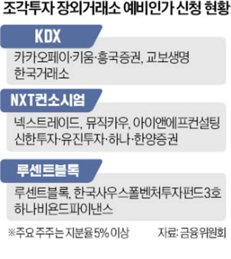 금융위원회가 조각투자 장외거래소 사업자를 최대 2곳만 인가하는 방향으로 가닥을 잡은 것으로 파악됐다. 한국거래소·코스콤 컨소시엄(KDX)과 넥스트레이드·뮤직카우 컨소시엄(NXT)이 유력 후보로 거론된다. 공정성 논란을 제기했던 루센트블록은 예비인가 대상에서 제외될 가능성이 큰 것으로 알려졌다.