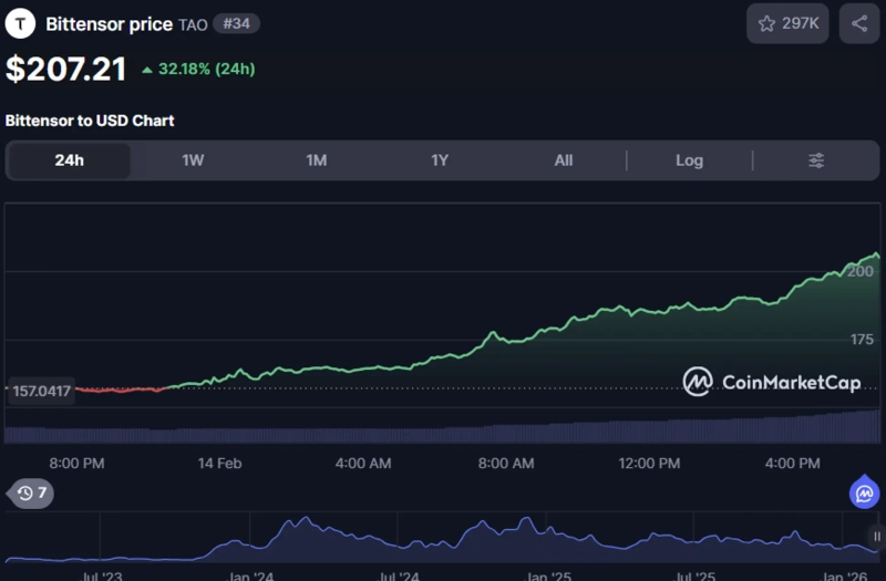 - 14일 오후 6시 20분 현재 비텐서(TAO)는 전일대비 32.18% 급등한 207.21달러에 거래되고 있다고 밝혔다.